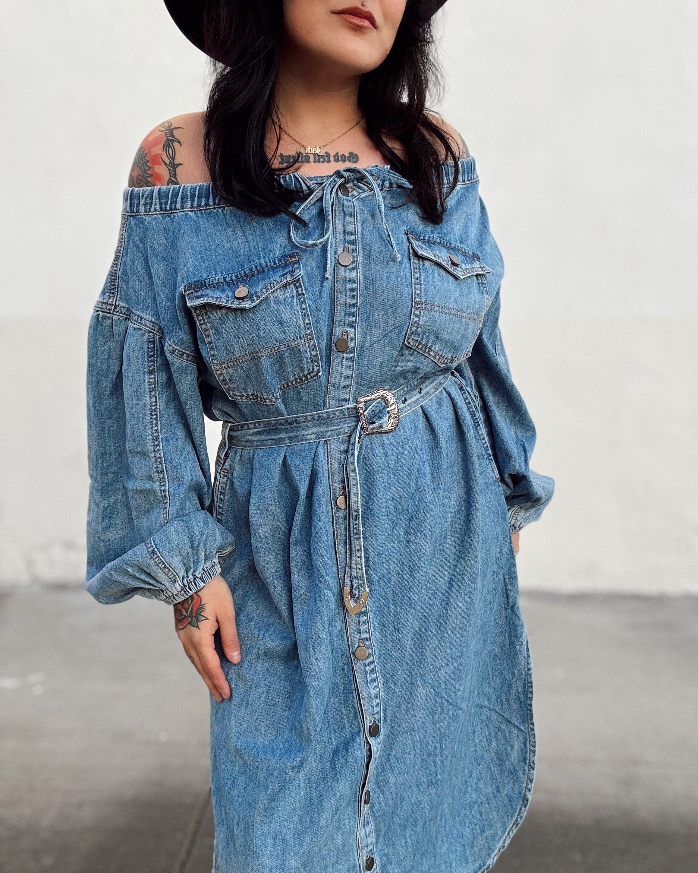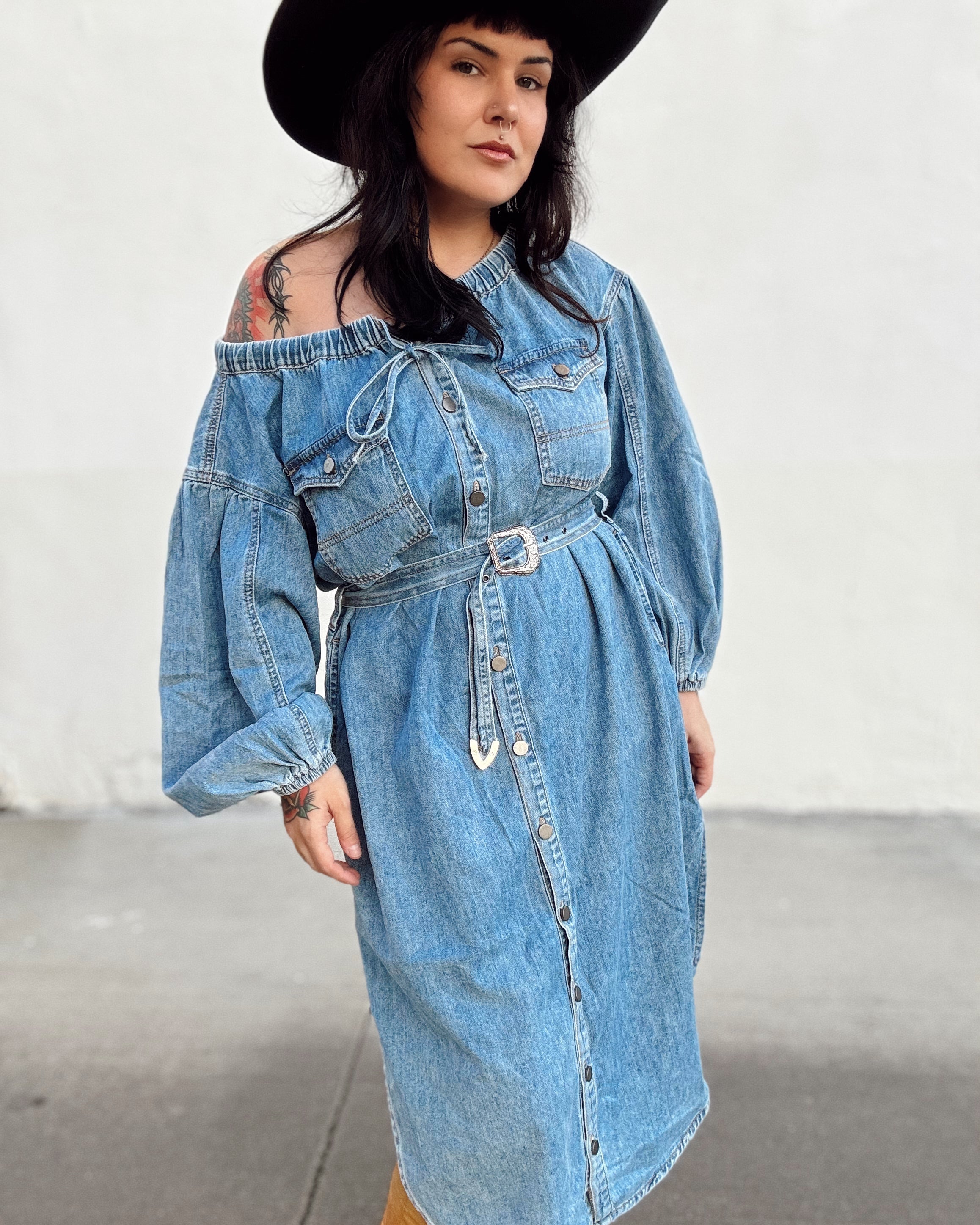 Off The Shoulder Denim Midi Dress
